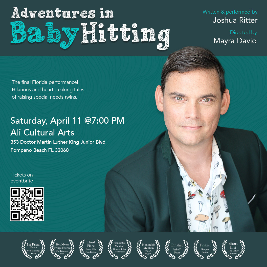 It is my pleasure to write on behalf of Adventures in Baby Hitting, which was proudly presented at the 2025 Fort Myers Fringe Festival. As part of our annual festival celebrating bold, original, and thought-provoking work, Adventures in Baby Hitting stood out not only for its sharp writing and commanding performance by Joshua Ritter, but also for its fearless exploration of complex themes of juggling an acting career while caring for infant twin mentally and physically challenged boys.